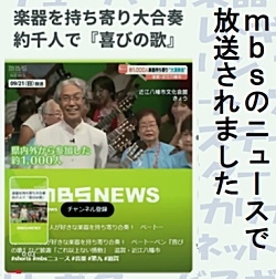 1,000人の大合奏「よろこびの歌」1000人達成!ありがとうございました! 2025年9月21日(日)近江八幡市文化会大ホール、1000名の参加者、44種類の楽器が 集まりました!“みんなでつくる1000人の大合奏「よろこびの歌」”が実現しました! 2022年の暮れに計画を発表し、2023年に“100人のオブラディオブラダ”、2024年に“300人の 線路は続くよどこまでも” を行い、準備を整えてきました。しかし、やはり1000人は 高くて厚い壁でした。それでも、市民オケをはじめとする皆さんの応援で、開催前日には 参加申込者が921名になっておりました。たくさんの方が最後の一押しと声がけしてくれたり、 朝日新聞が前日の朝刊で大きく取り上げてくれたり、機運がグッと高まってきたように 感じました。そして、当日。いざ、大合奏へと進もうとした折りに、受付を指揮していた 団長の中尾さんから「当日参加者が80名を超えた!」との報告を受けました。 名実共に“1000名の大合奏”が実現したのです。何というドラマでしょうか。 さて、1000人の響きはいかだったでしょうか?私の一番心配していたことは、特定の音の 大きい楽器が全体の色を決めてしまい、各楽器の良さが全て吹き飛んでしまうことでした。 が、その心配は、最初のフレールジャックの音出しで吹き飛んでしましました。調和が とれているのです。弾く楽器、吹く楽器、叩く楽器それぞれがその特長を活かして演奏 していました。私はいつの間にか大規模な市民オケをやっているような気分になり、 いつもの調子で太鼓に注文をつけたり表現について解説したり……。 「ああ、これは大合奏でなく、大市民ギターオーケストラ何だ」と納得した次第です。楽しかった! 一月からチラシ配布、インスタ開設、街やコミセンでの呼びかけ。そして、楽譜クリップ、 竹楽器の製作に当日の運営準備から終わりまで、市民オケの皆さん、 誠にありがとうございました。 ![]() ![]()  |